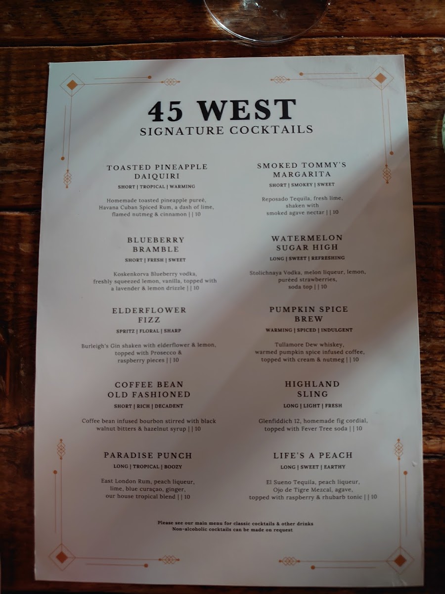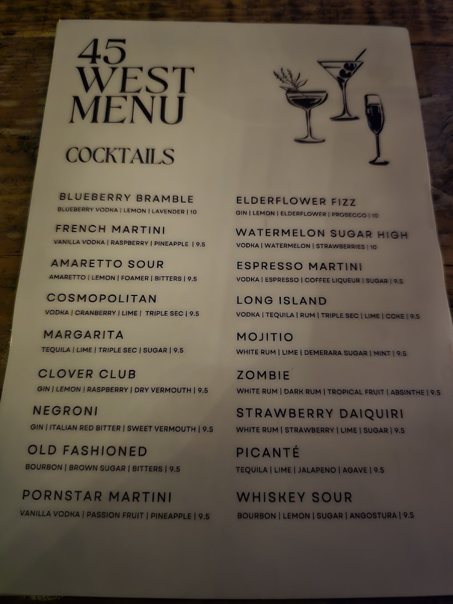 The highlight of 45 West is undoubtedly its carefully curated menu, featuring a diverse range of offerings to cater to various tastes. From classic cocktails to innovative mixes, each drink is thoughtfully designed, often with an emphasis on local ingredients and distilleries. The staff, well-versed in their craft, are happy to offer recommendations based on personal preferences, ensuring that even the most discerning patrons find something that suits their tastes.
